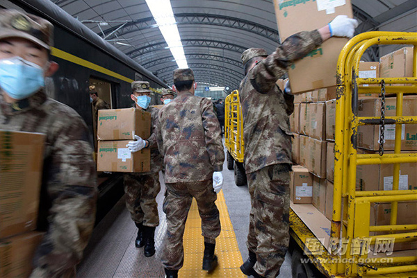 首批卫生物资抵达:1月26日上午,全军首批从辽宁沈阳、山东菏泽紧急调拨一次性C级防护服10000套、乙醇酒精3760瓶等卫生物资抵达武汉,军队前方指挥协调组协调军地双方进行物资交接,全部送达一线。(图片来源:国防部网站)