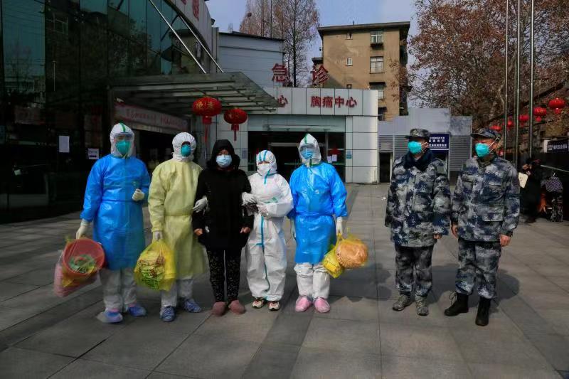 重症患者出院:1月28日中午,59岁的武汉市民刘桂芝在空军军医大学医疗队专家陪同下,缓缓走出武昌医院。当天,有两名军地联手治愈的肺炎重症患者出院。(图片来源:军报记者微信公众号)