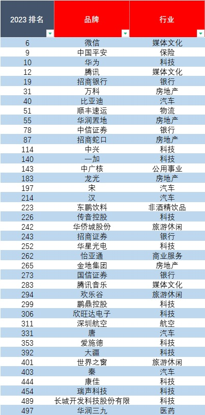 图中为2023年中国品牌价值500强中39个上榜的深圳品牌