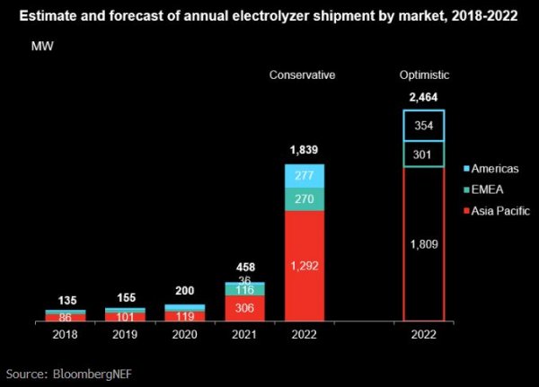 电解槽年出货量的估计和预测(来自:BNEF)