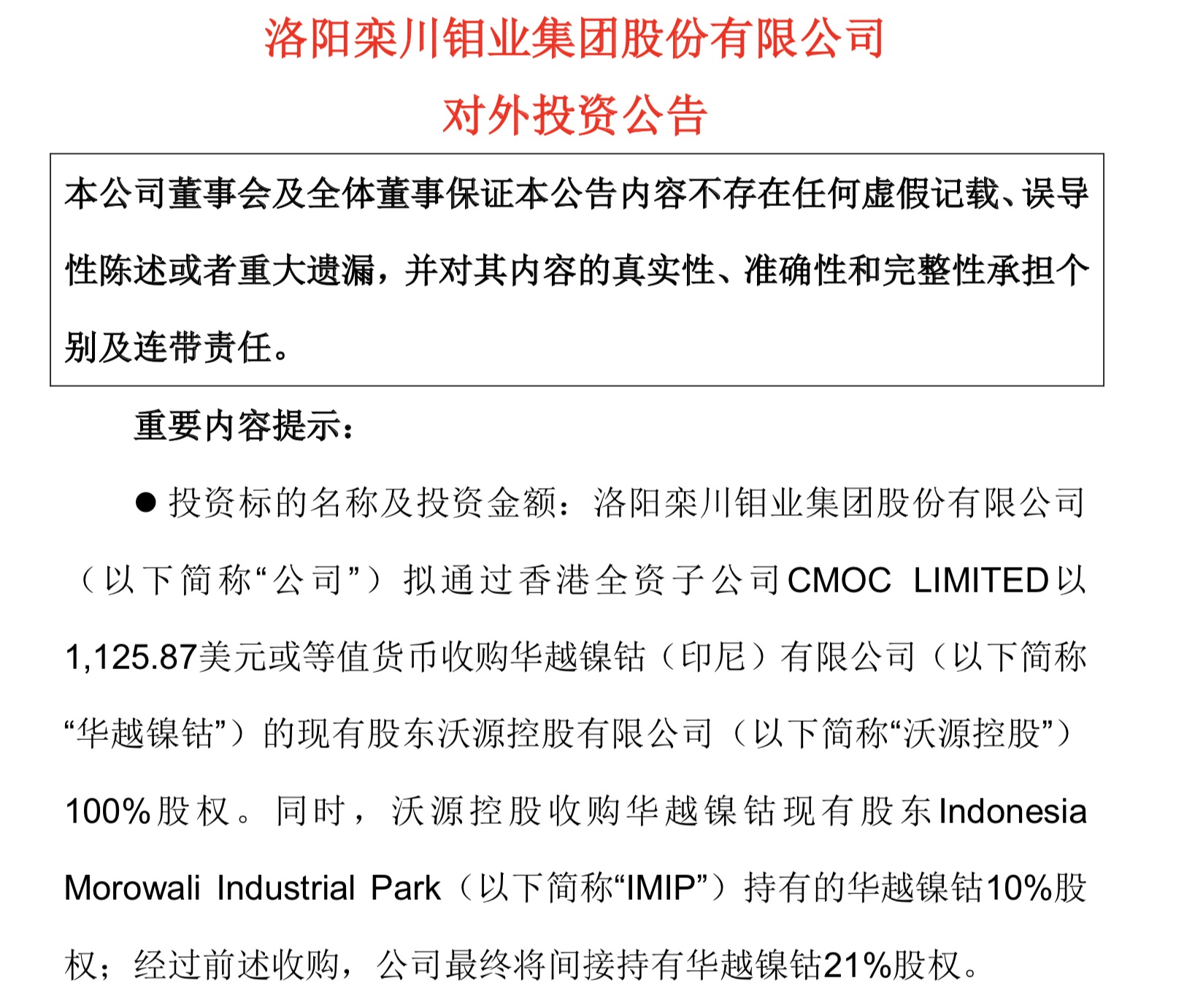 11月8日,国内矿业巨头洛阳栾川钼业集团股份有限公司(下称“洛阳钼业”,603993.SH)发布公告:拟通过香港全资子公司CMOC LIMITED以1125.87美元或等值货币收购华越镍钴(印尼)有限公司(下称“华越镍钴”)的现有股东沃源控股有限公司(下称“沃源控股”)100%股权。同时,沃源控股收购华越镍钴现有股东Indonesia Morowali Industrial Park(下称“IMIP”)持有的华越镍钴10%股权。