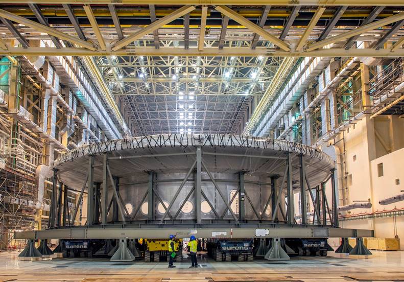 据了解,杜瓦底座是托卡马克装置压力容器的底座,承担着重要安全屏障作用,是托卡马克装置安装第一个重大组件,吊装重量1200吨,设备最终就位偏差不超过2mm,吊装操作难度大、测量技术要求高,其安装精度、进度都对主体结构及重要部件安装产生重要影响。目前,来自中核集团中核工程欧洲公司、中核二三的48名人员正在法国ITER现场开展相关工作。
