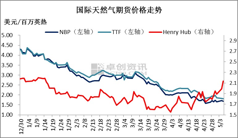 影响美国天然气供需形势及预期的主要因素是天气、库存及产量等。供需方面,美国能源信息署报告显示,截至4月24日当周,美国天然气库存量22100亿立方英尺,比前一周增加700亿立方英尺;库存量比去年同期高7830亿立方英尺,增幅54.9%;比5年平均值高3600亿立方英尺,增幅19.5%。