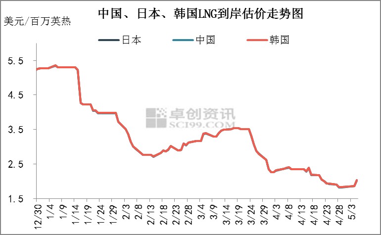 中国、日本、韩国LNG到岸估价走势图,来源:卓创华体会(中国)