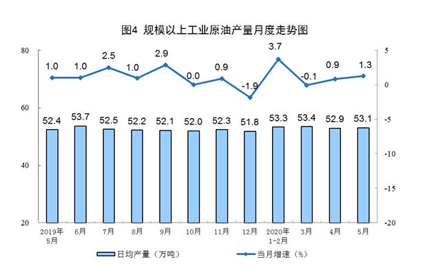 原油生产有所加快,加工量较快增长。5月份,生产原油1646万吨,同比增长1.3%,增速比上月加快0.4个百分点;加工原油5790万吨,增长8.2%,比上月加快7.4个百分点。1—5月份,生产原油8090万吨,同比增长1.9%;加工原油26139万吨,下降1.0%。