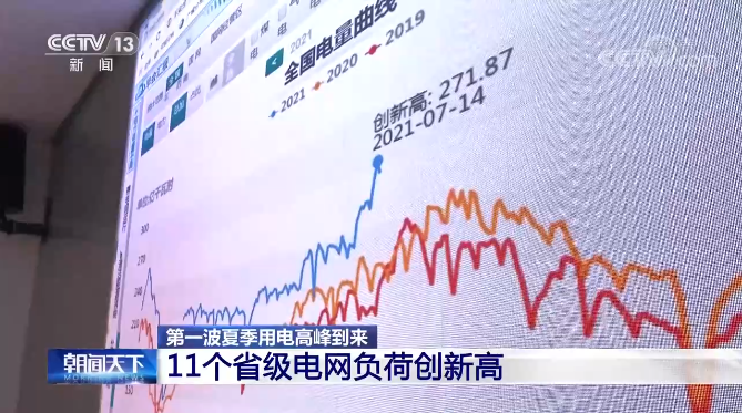 11个省级电网负荷创新高 全国日用电量在7月14日刷新了历史纪录,达到271.87亿千瓦时,比去年夏季的最高值增长超过了10%,比今年年初的极端寒潮天气情况下用电量增长也超过了4.7%。 国家电力调度控制中心副主任 朱伟江:主要是受天气因素的影响,再叠加上经济快速发展的这么一个态势,所以造成了7月中旬以来用电负荷有一个明显的上升,也就是第一波高峰的到来。