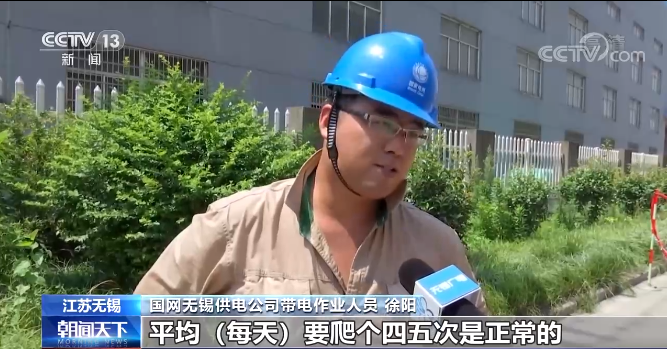 陕西电网也是9次刷新夏季最大负荷纪录,同比去年夏天增长19.9%。预计未来一段时间,多座变电站可能会出现负荷重载或过载,目前国网陕西电力正在加强设备运维,保障重载、满载设备安全稳定运行,满足高峰负荷时段用电需求。 江苏日用电负荷突破1.2亿千瓦,同比增长4.6%。南京、苏州、无锡、扬州等市用电负荷创新高。不少城市的电力工人,冒着三十八九度的高温,穿着密不透风的屏蔽服,带电抢修线路,三个小时下来,几乎人都湿透了。 国网无锡供电公司带电作业人员 徐阳:基本上,我们班组平均(每天)要爬个四五次是正常的,要保证我们后面居民的用电。不然的话,老百姓(在)炎热的夏天,他们也不舒服。