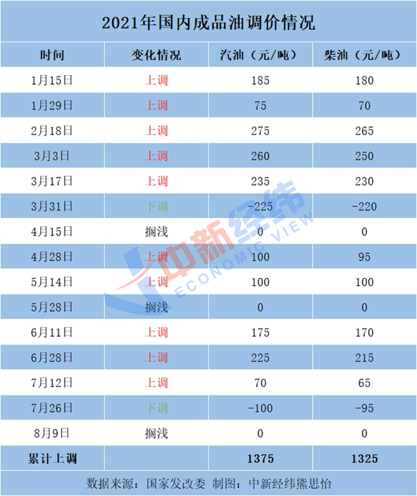 中新经纬客户端注意到,2021年以来国内成品油已进行15轮调价,汽油价格总计上调1375元/吨,柴油价格总计上调1325元/吨,呈现“十涨两跌三搁浅”的格局。如果本轮下调预期实现,将呈现“十涨三跌三搁浅”格局。  对于私家车主而言,本轮下调预期落实后,用油成本将显著下降。王珊指出,以每吨下调230元/吨来计算。汽油方面,一辆油箱容积为60升的私家车加满一箱油较上一周期将减少11元左右支出。