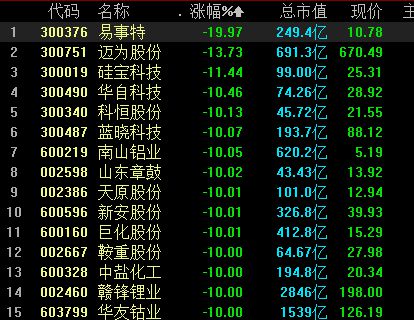 雅化集团(002497)、藏格控股(000408)、西藏珠峰(600338)、盛新锂能(002240)等个股均跌超6%。亿纬锂能(300014)、比亚迪(002594)、永兴材料(002756)等多股大幅下挫。