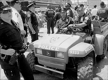 美国政府鼓励研发和使用新型能源车,并规定购买燃料电池车等新型车的消费者可享受抵税优惠。图为几名警察驾驶一辆电池车在美国纽约市布鲁克林区值勤。