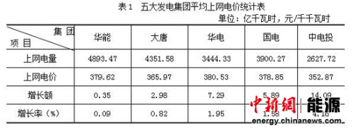 从企业看,中央发电企业平均上网电价为372.42元/千千瓦时,比2009年增长1.94%;地方及外资发电企业平均上网电价为402.51元/千千瓦时,比2009年降低3.65%。五大发电集团平均上网电价情况见表1。