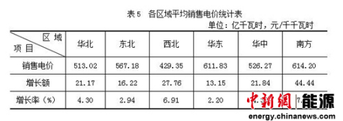 从区域看,南方区域平均销售电价最高,为614.20元/千千瓦时,依次为华东、东北、华中、华北,西北最低,为429.35元/千千瓦时(见表5)。