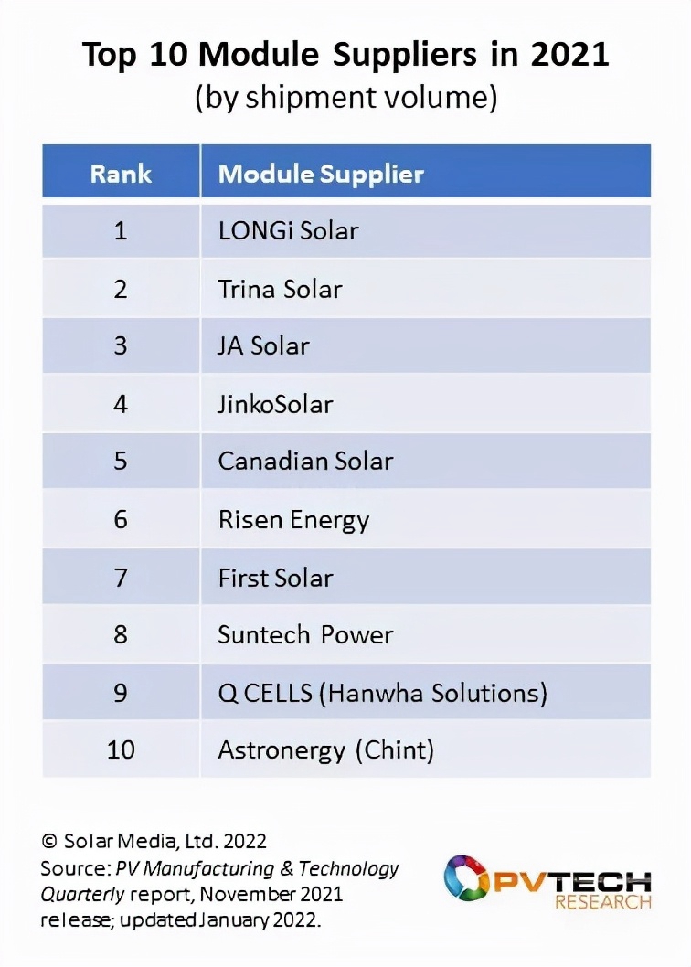 近日,PV-Tech(全球知名光伏媒体)发布了《2021年全球组件供应商top10》。榜单显示,前十名中我国本土企业占据了7席,且包揽前三名。美国、加拿大、韩国各有1家企业上榜。