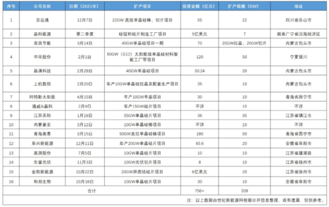 硅片板块依然延续了强势扩产的趋势,虽然较之2020年300GW+的扩产规模有所降低,但依旧不可小觑。世纪新能源网不完全统计,2021年,硅片2021年扩产投资金额超756亿元。